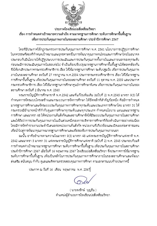 การกำหนดค่าเป้าหมายความสำเร็จ ตามมาตรฐานการศึกษา ระดับการศึกษาขั้นพื้นฐาน เพื่อการประกันคุณภาพภายในของสถานศึกษา ประจำปีการศึกษา 2567 14 มิ.ย. 67